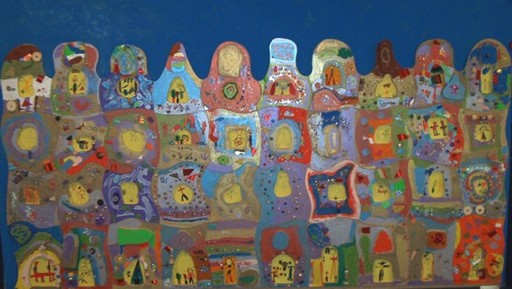 Materiaalkosten in overleg. Bij de (groeps-) schoolkunstwerken zoals de woonpuzzel hiernaast komen er kosten bij voor de voorbereiding (zagen, vervoer) en de montage in, of aan de buitenkant van de school.