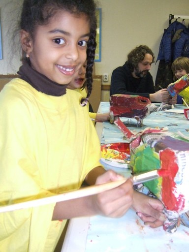 Daarna maken ze de definiteve illustratie, een echt schilderij op doek achter een ezeltje met acrylverf.